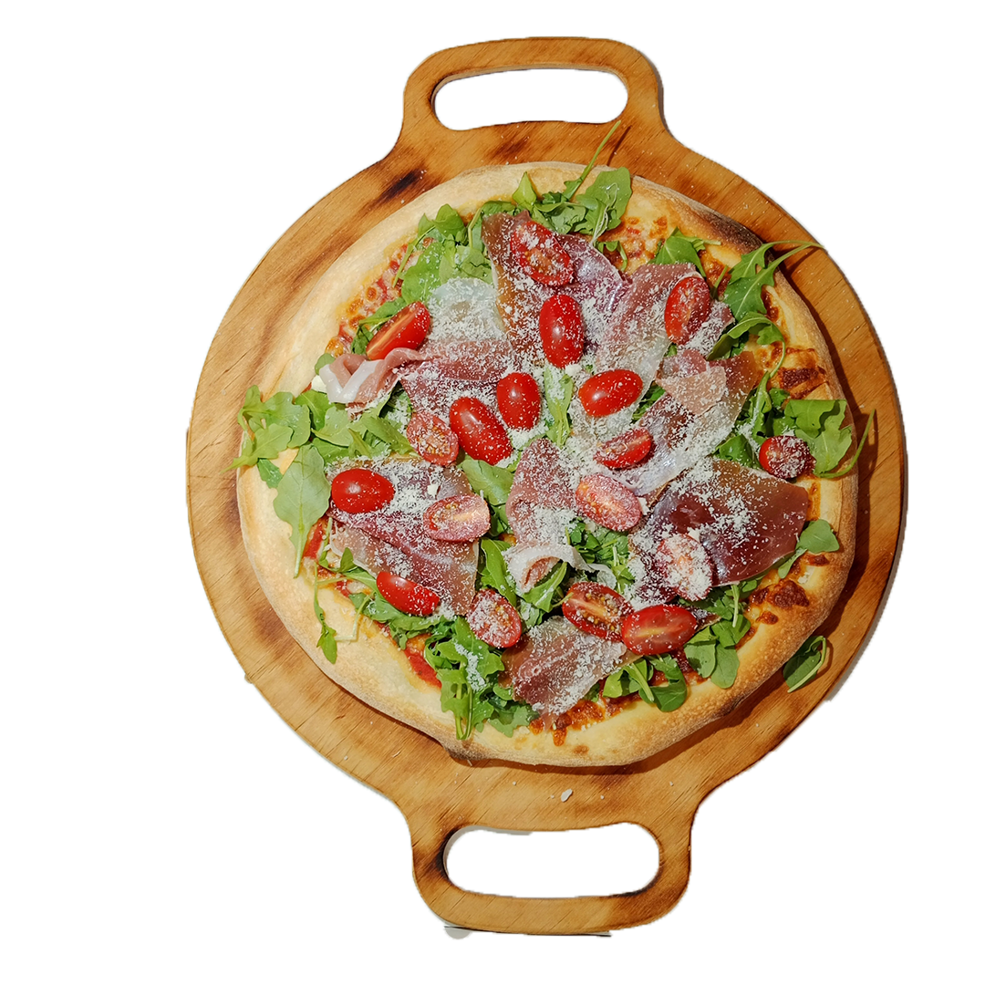 sos, ser, rucola, szynka dojrzewająca, pomidorki, parmezan -
